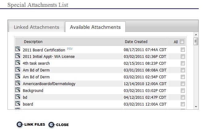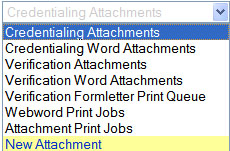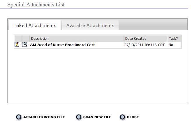 In many provider data areas there is a paperclip icon on the toolbar where existing attachments can be viewed or new attachments may be uploaded and "linked" to a specific piece of data. The linked attachment concept has been expanded to include the main Credentialing Attachment area and the Verification area.