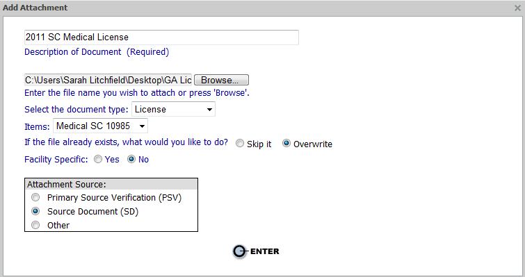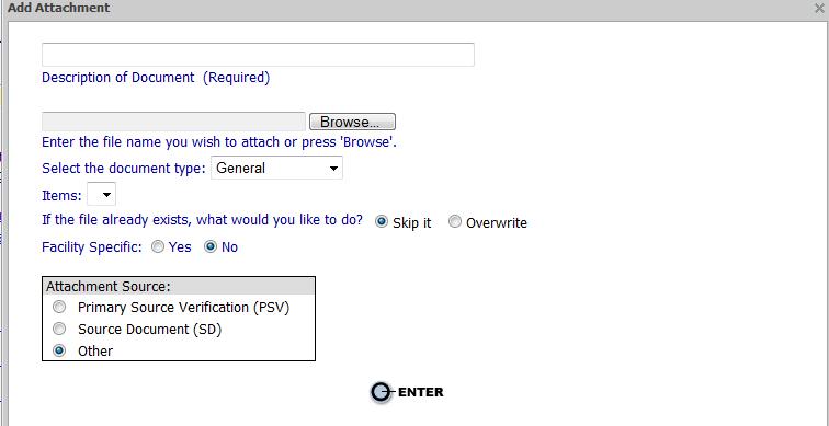 Enter a Description of Document (required) and browse for the file on your computer or shared drive. Next pick the Document Type from the select box and choose the data item itself from the next select box. Finally, tag the attachment as Source, PSV or Other to further classify it.