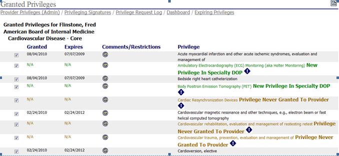 GREEN: New privileges added to the specialty during the last privileging cycle but not pushed to the provider are displayed in green. Although the provider has not had the privilege previously, it is easy to add it to his requested privileges as the box will be checked by default.