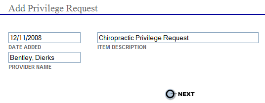 If the provider currently has privileging specialties two radio buttons will display in the "Add Privilege Request" page. Select the appropriate radio button, type in an item description and click the Next button. Follow the steps below to "Re-privilege Existing Specialties" or "Add Additional Specialties/Privileges".