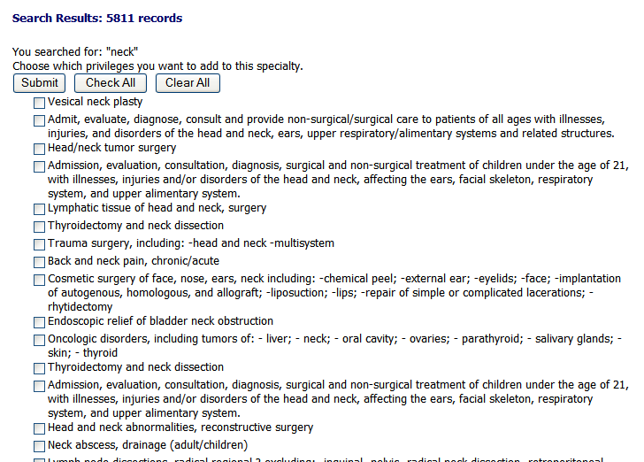 To re-privilege all the privileges listed select the "Check All" button, or select "Clear All" and check only the privilege(s) you wish to re-privilege. You may also click the "Check All" button as well as the "Save and Add Additional Privileges" button. The "Specialties" window is displayed.