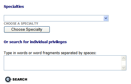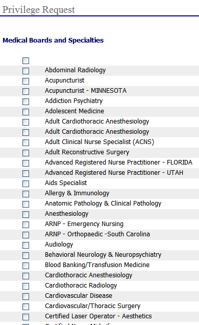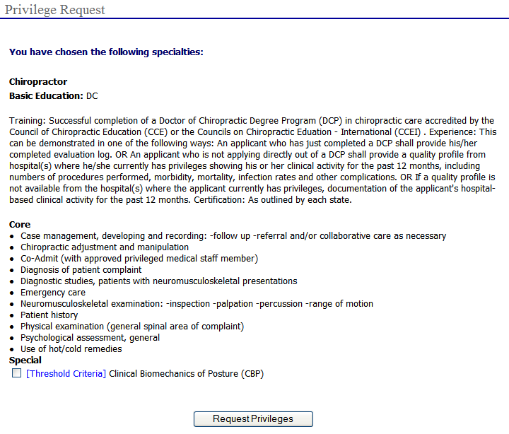 If this is the first request for a privilege the user will be taken directly to the "Specialties" page. Refer to the "Adding Privileges to a Provider that Currently Does Not have any Privileges Granted" section below.